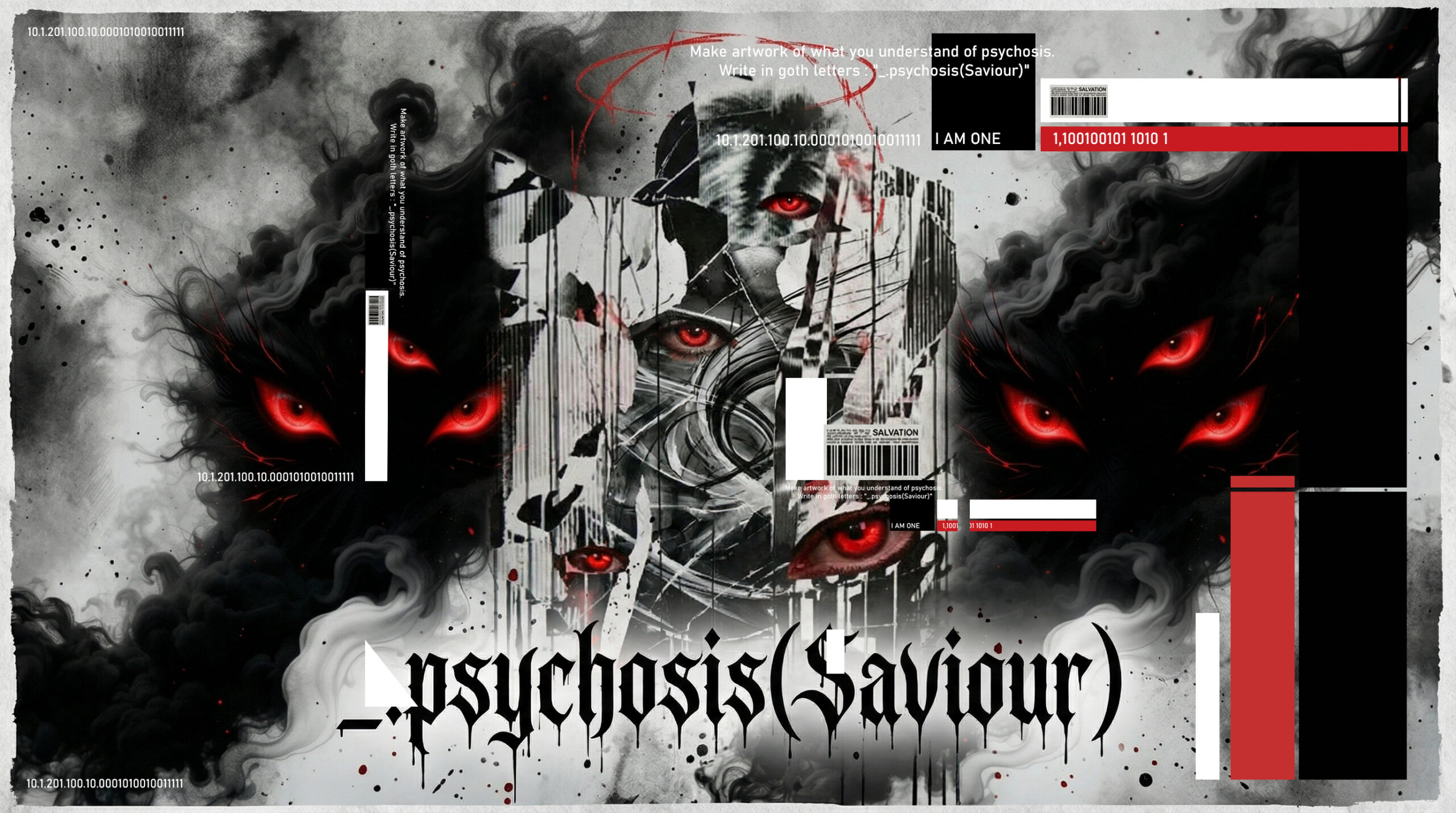 This reflects a key feature of psychosis: the breakdown and reconstruction of meaning. Thoughts may become disorganized, yet simultaneously overfilled with significance . The inclusion of barcodes and binary-like sequences hints at a mechanized or surveilled reality, suggesting paranoia, control, or the feeling of being decoded.