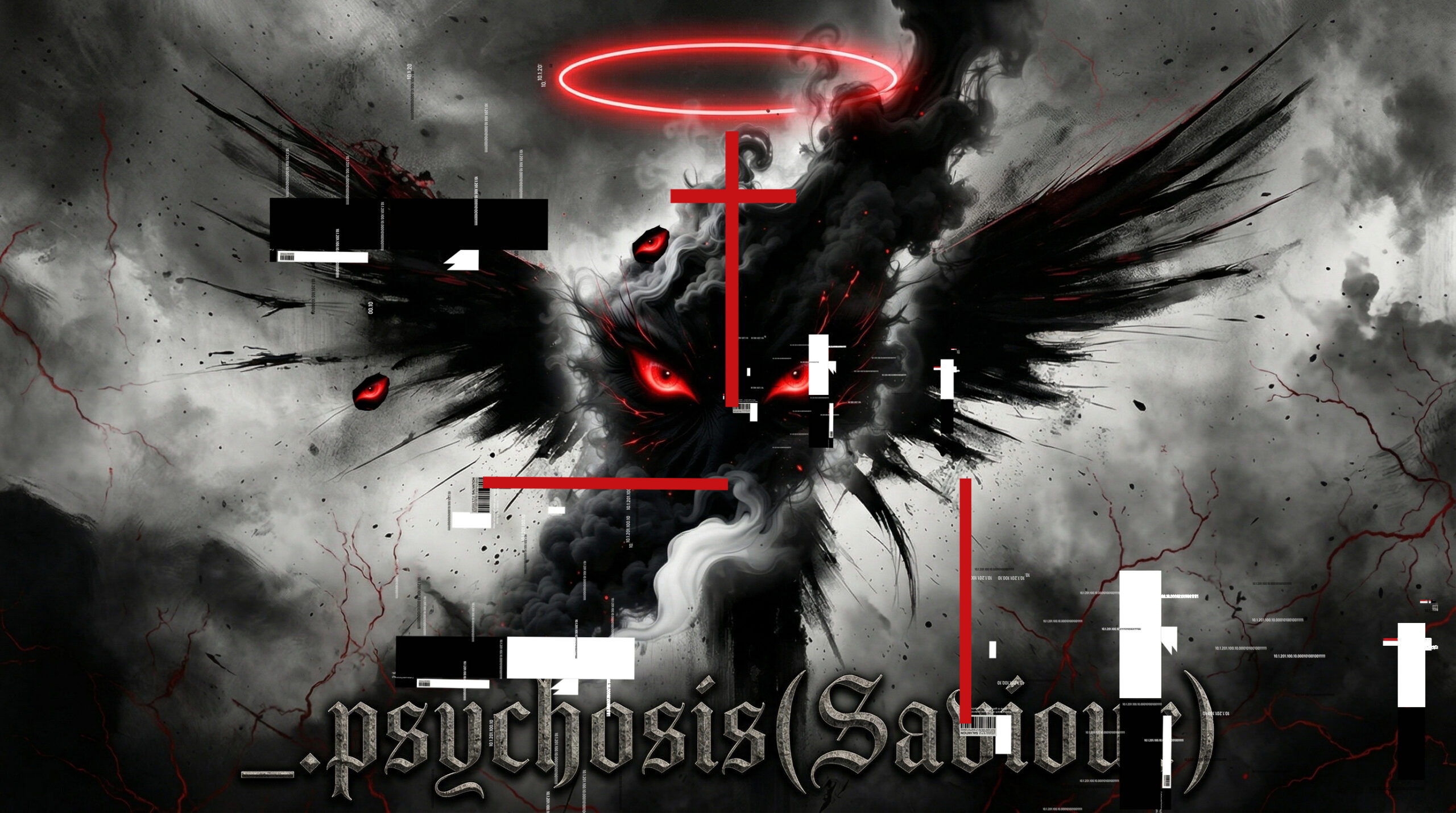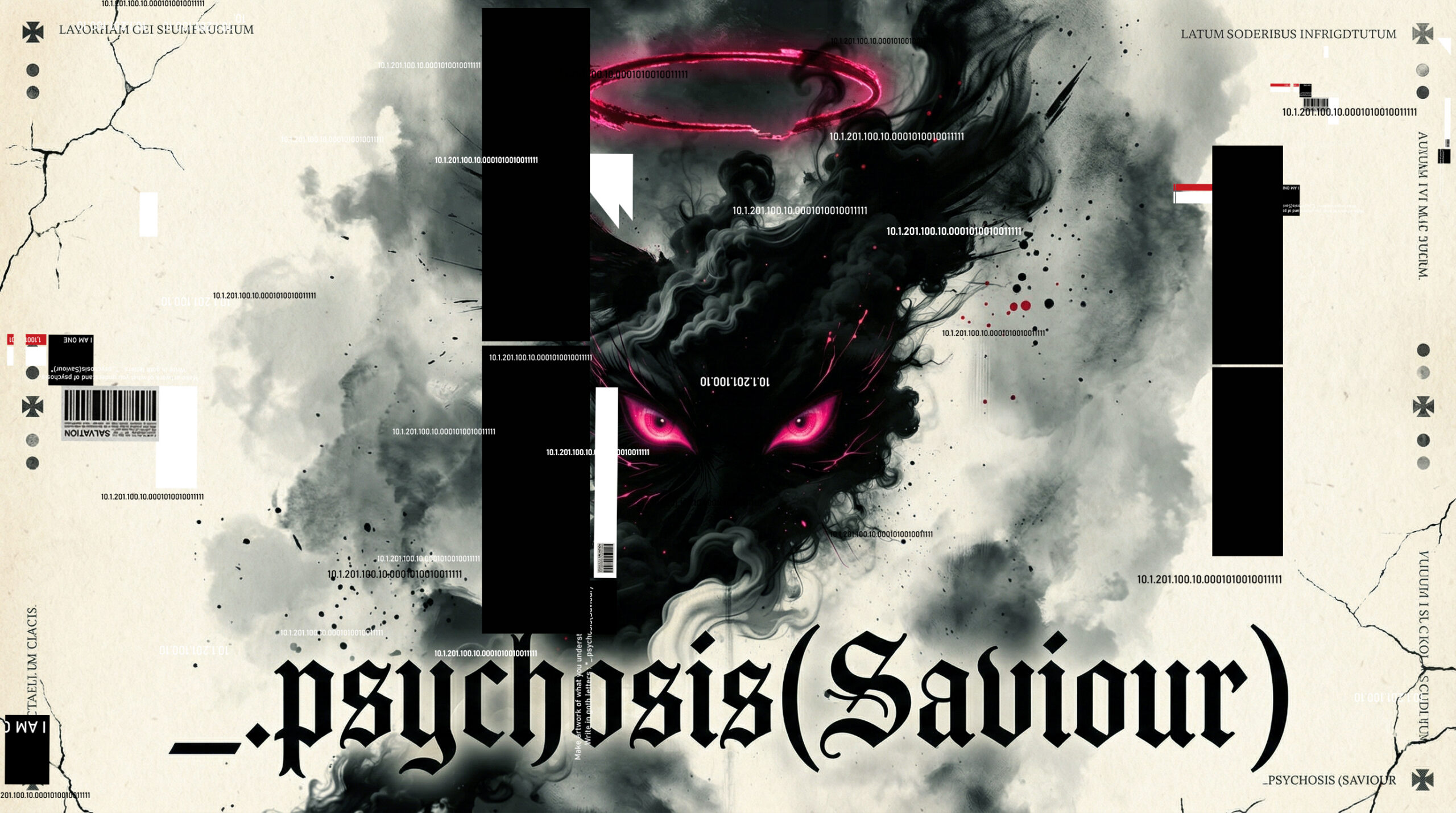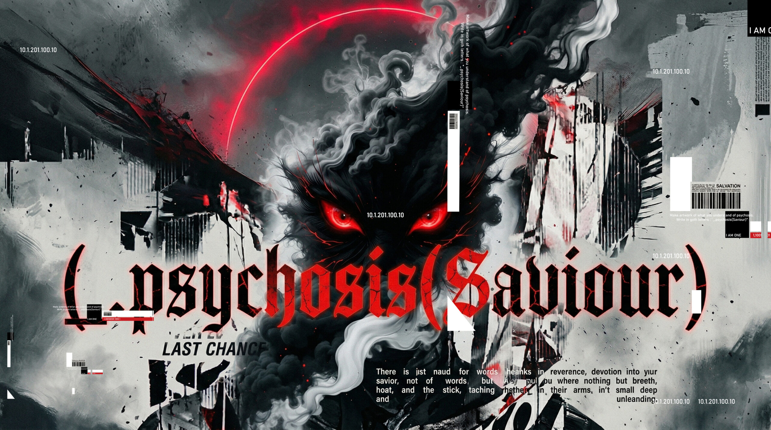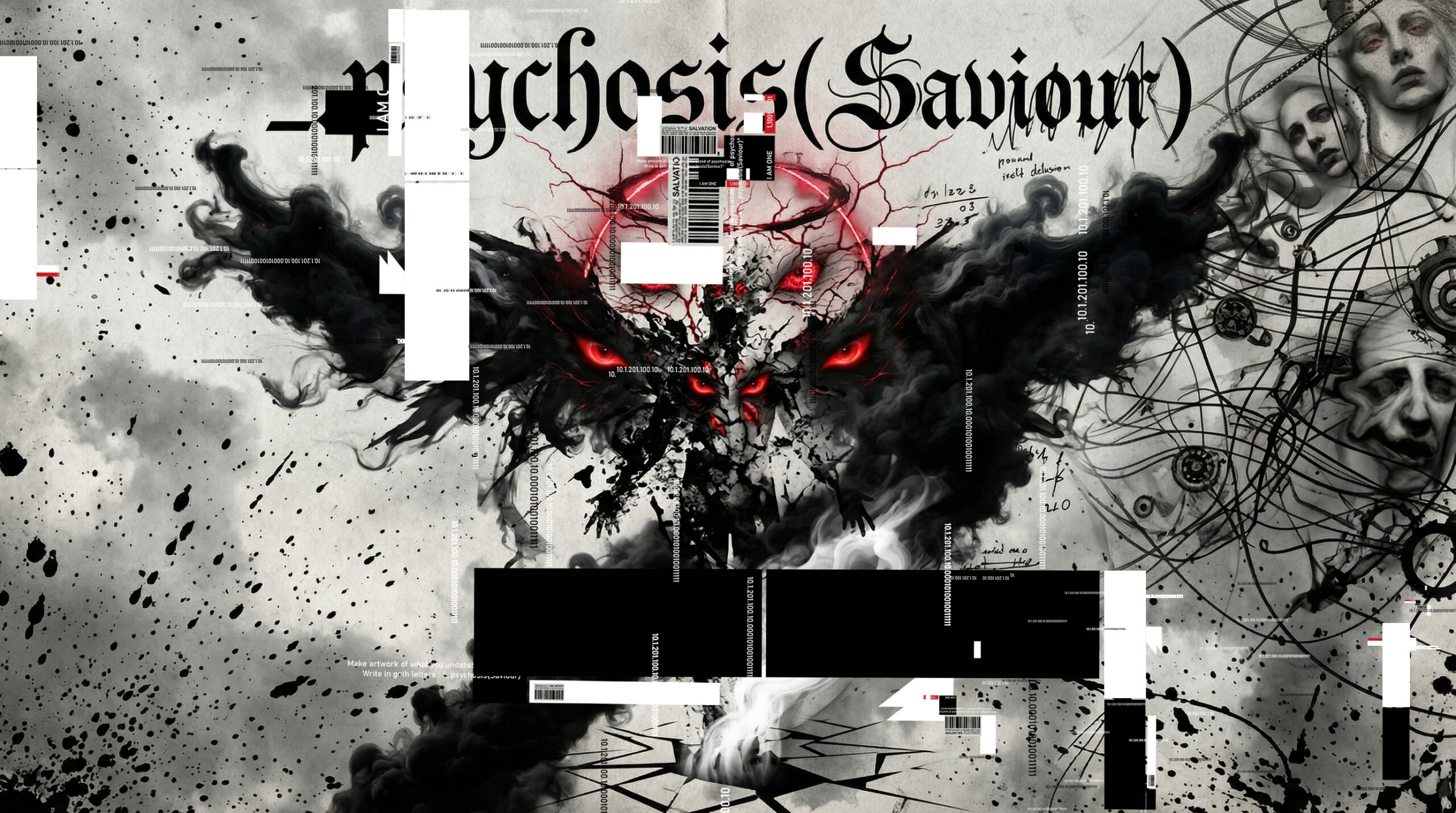 The artwork Psychosis (Saviour) unfolds as a violent collision between identity and dissolution—a visual field where the mind no longer behaves as a stable narrator, but fractures into competing realities. At its center emerges a shadowed entity: neither human nor entirely symbolic, but something in between—formed from smoke, absence, and intensity. Its glowing red eyes act as anchors in chaos, suggesting a consciousness that is hyper-aware yet profoundly dislocated.