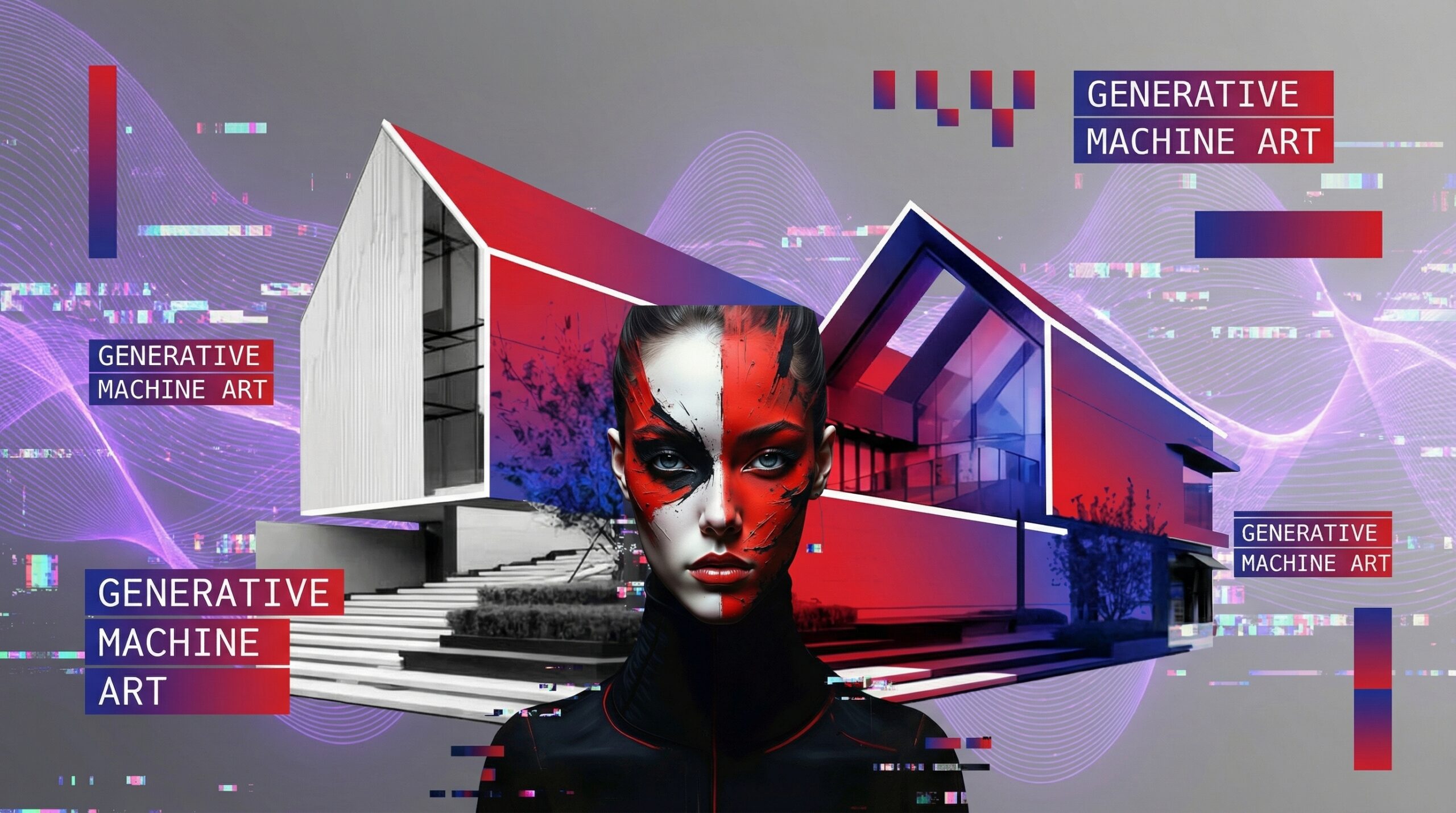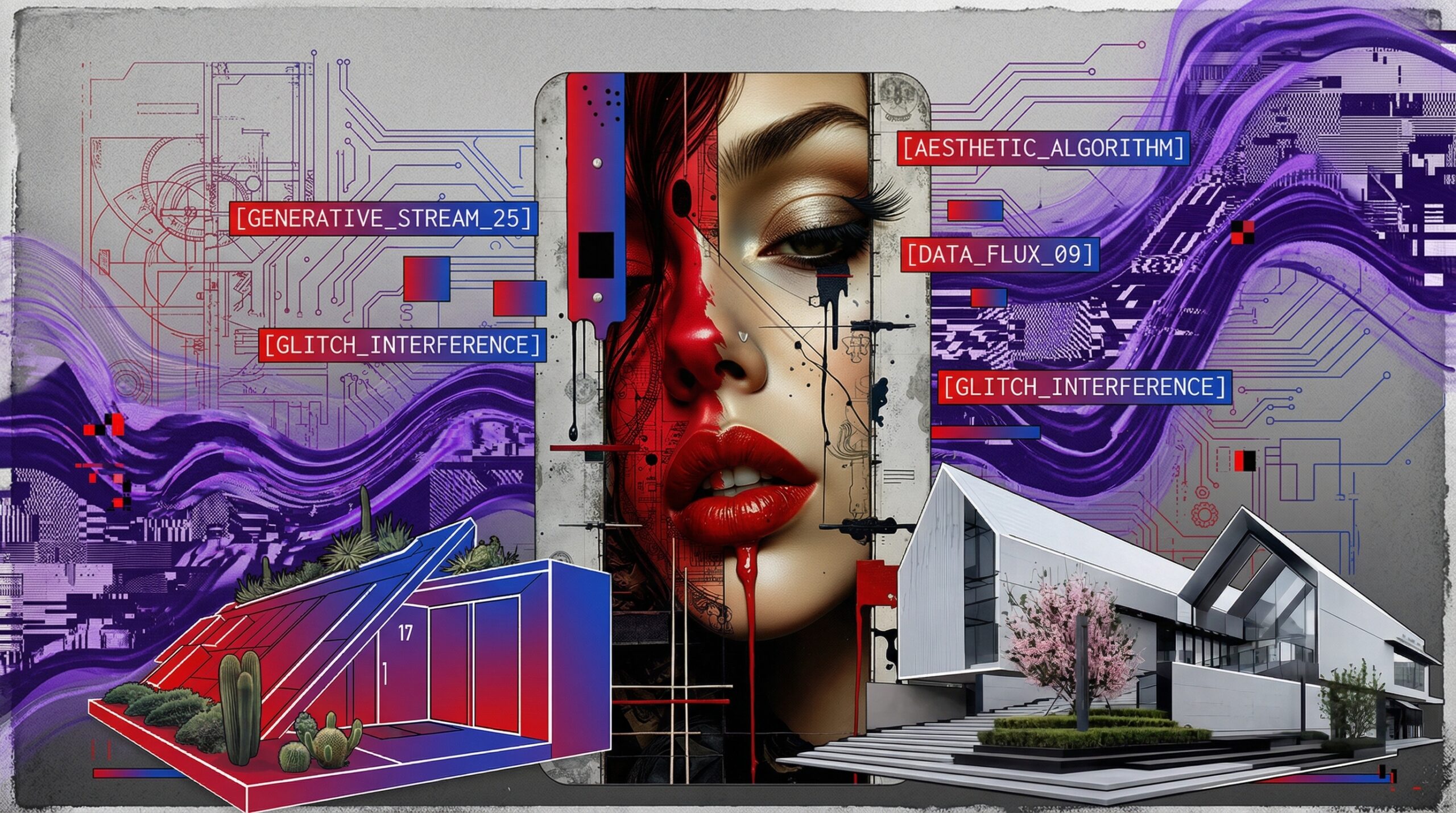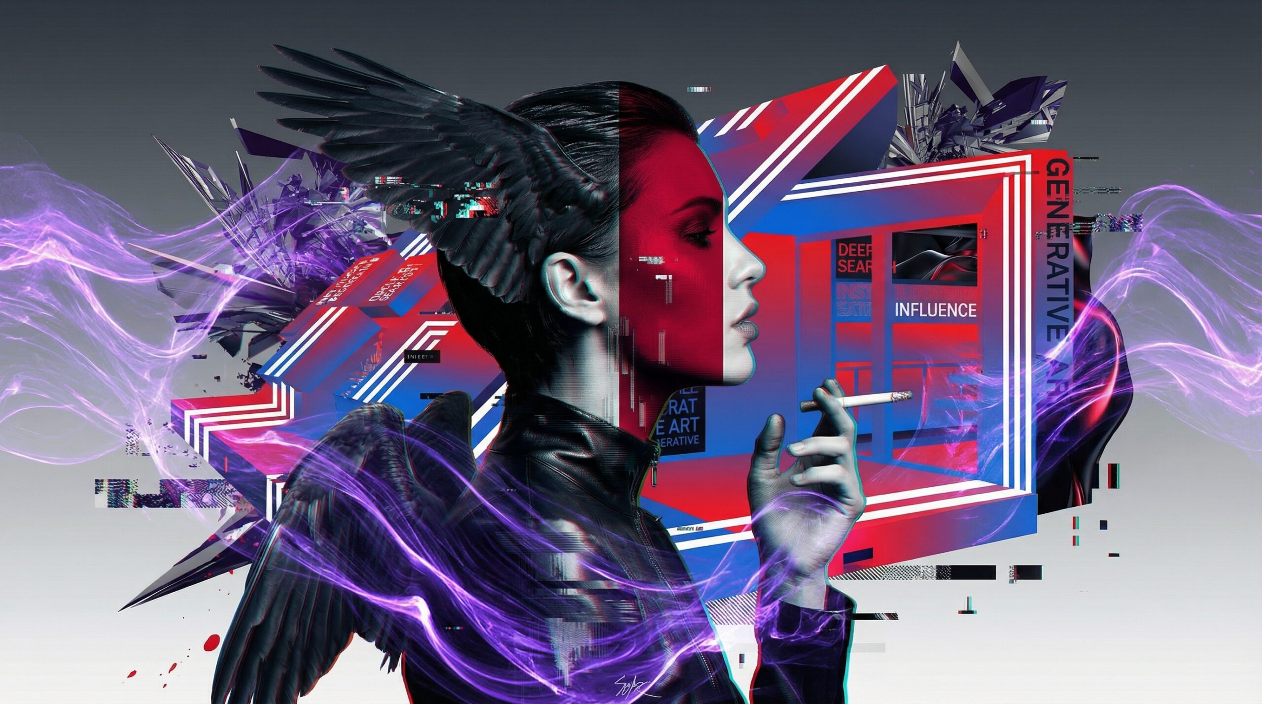 The figurative element is fused with a technological aesthetic: glitch effects, digital noise, and geometric forms create the impression that reality itself is breaking apart and reconstructing. These interruptions remind us that creativity today no longer emerges solely from organic experience, but also from algorithmic randomness. The phrases “Influencing Art” and “Generative Machine” are not just titles—they are declarations. Art is no longer only expression, but also a process shaped by machines.