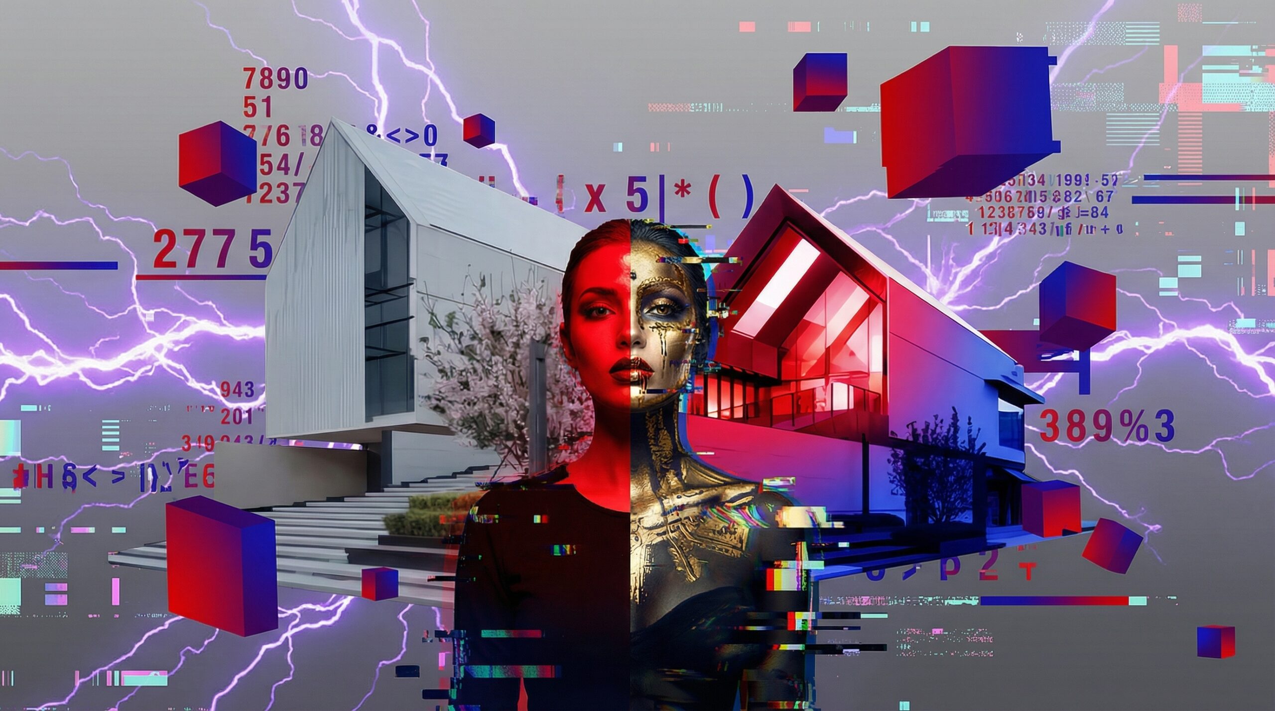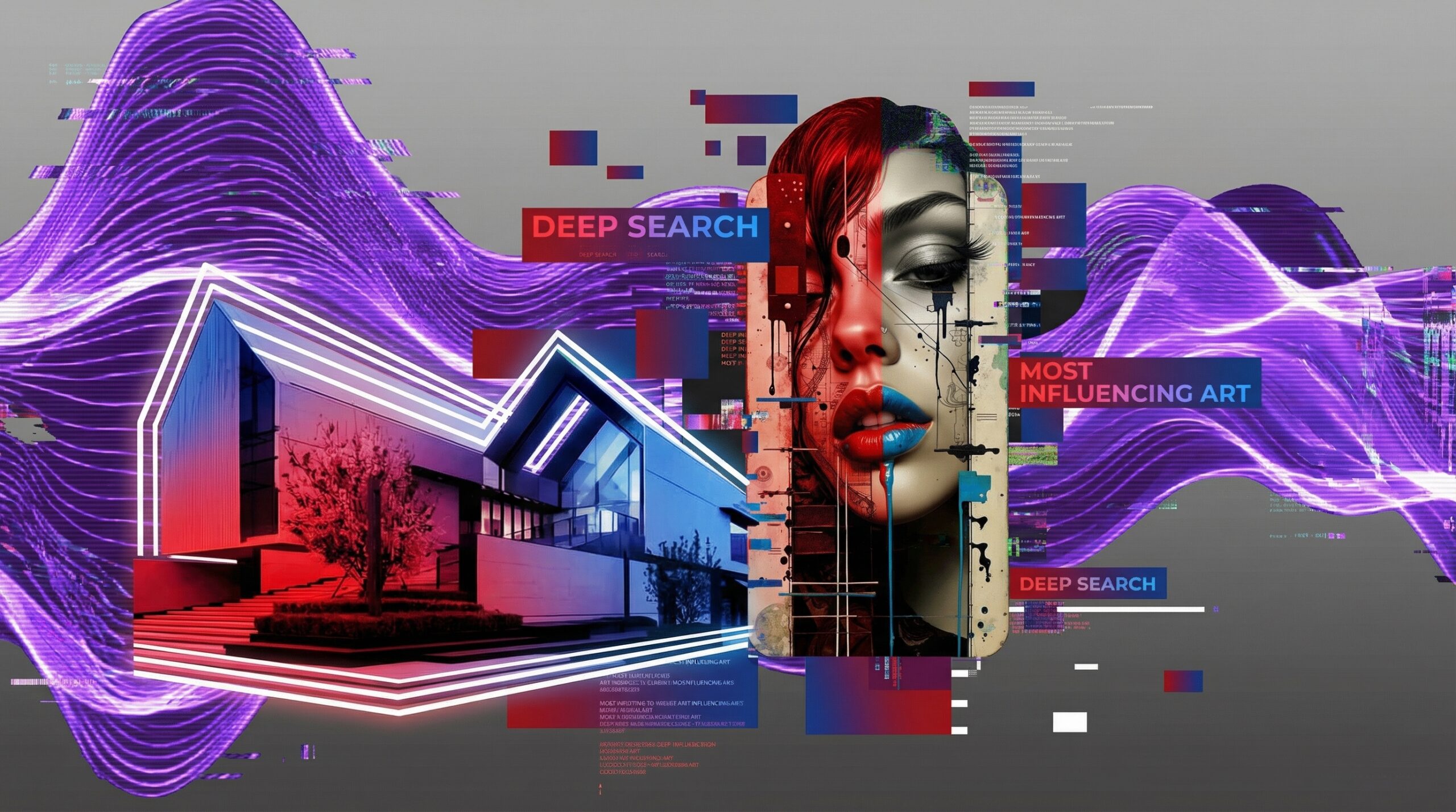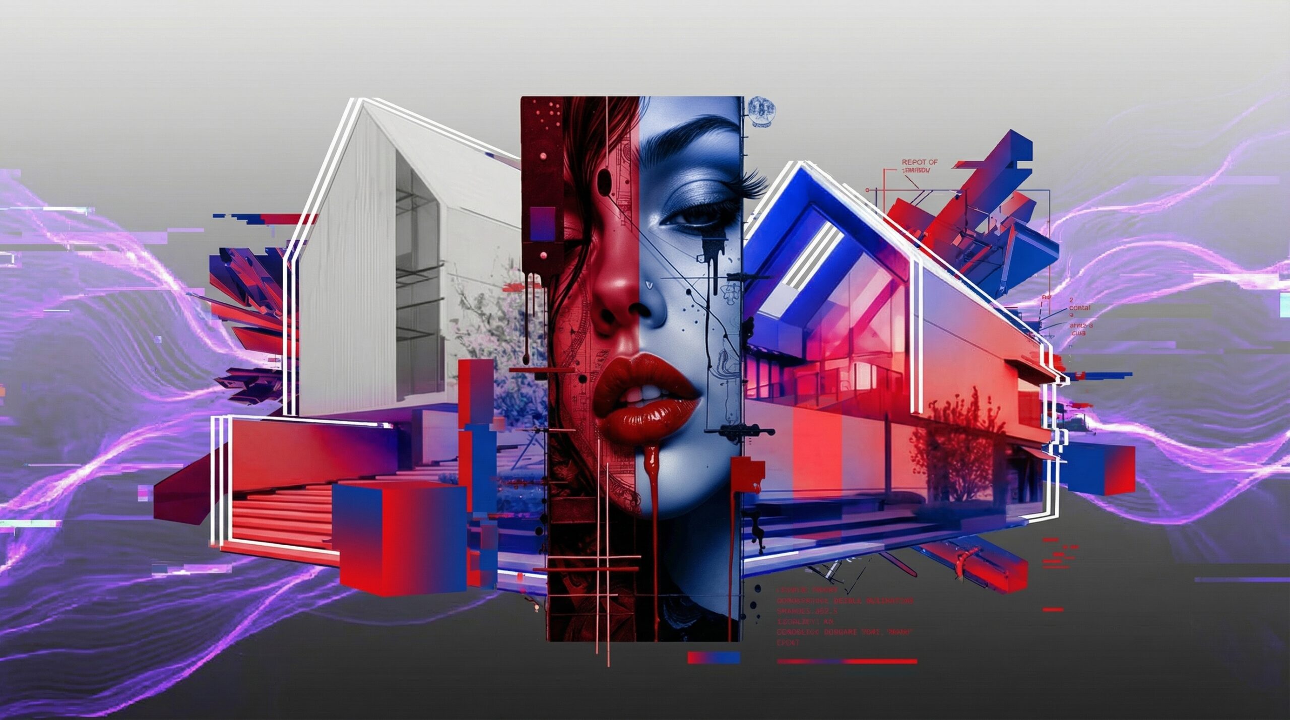The figurative element is fused with a technological aesthetic: glitch effects, digital noise, and geometric forms create the impression that reality itself is breaking apart and reconstructing. These interruptions remind us that creativity today no longer emerges solely from organic experience, but also from algorithmic randomness. The phrases “Influencing Art” and “Generative Machine” are not just titles—they are declarations. Art is no longer only expression, but also a process shaped by machines.