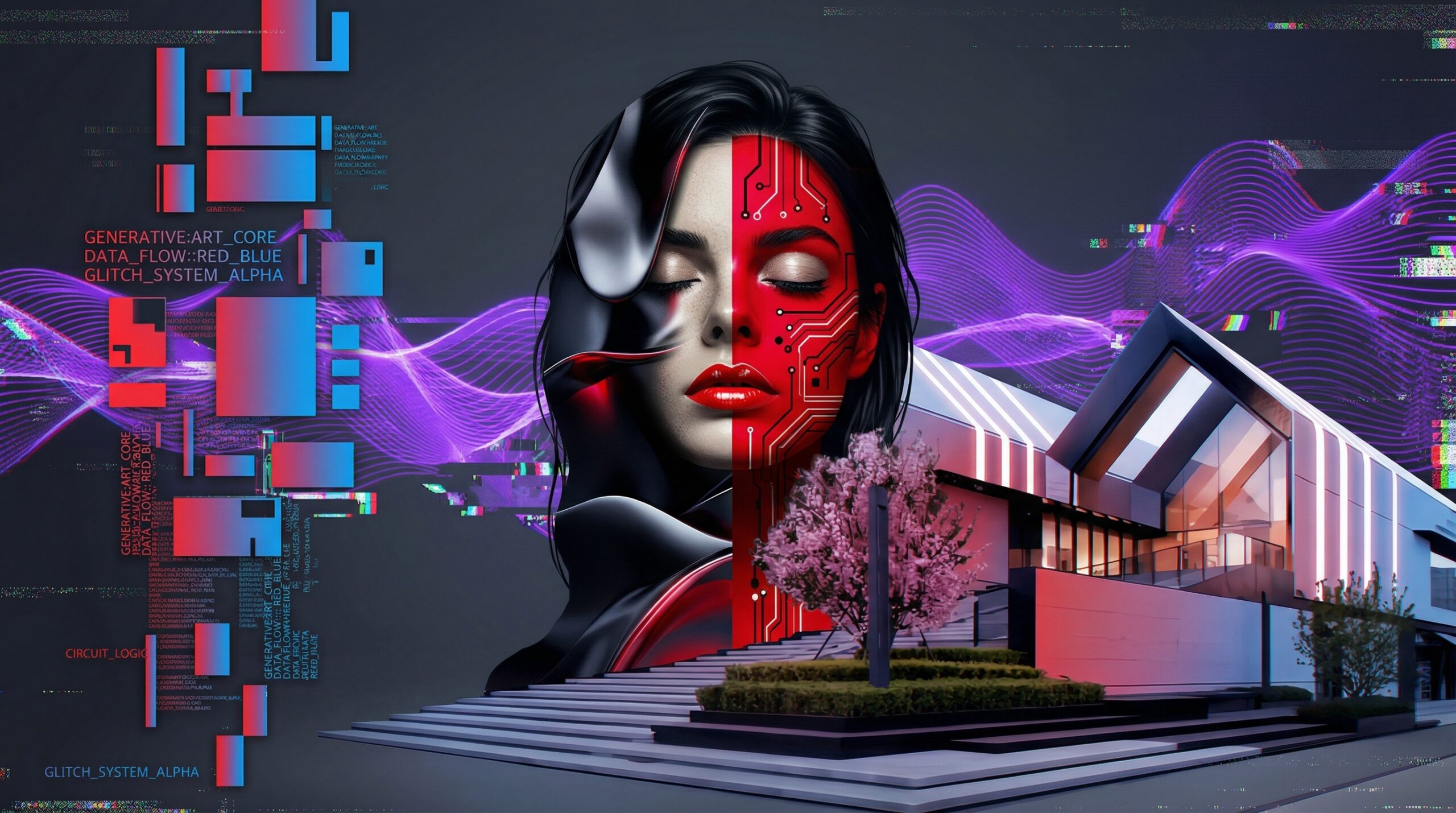 This image initially feels like a visual manifesto—a meeting point between human, machine, and imagination. At the center of the composition stands a hybrid figure whose face is split into two contrasting halves: red and white. This dualism suggests both a fractured identity and the creative tension between the human and the artificial. The face is not merely a portrait, but a symbol—the artist as an intermediary between two worlds.