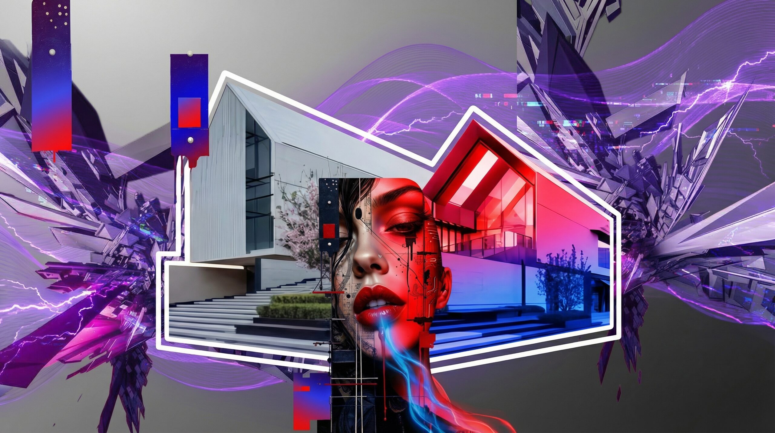 The use of color—intense contrasts of red, blue, and purple—creates emotional tension. Red evokes energy, conflict, and creativity, while blue suggests technology and cold rationality. Their fusion is not harmonious, but pulsating and dynamic, as if in constant transformation.