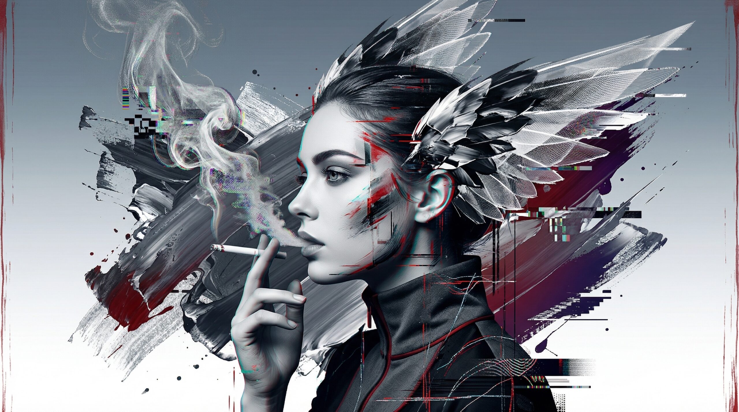 The bursts of red in the background evoke both blood and digital interference—simultaneously organic and artificial. From a psychoanalytic perspective, they may symbolize the eruption of repressed drives, emotional tensions breaking through the controlled surface of the image. They counterbalance the cool, monochromatic figure, introducing a sense of raw vitality and chaos beneath the apparent composure.