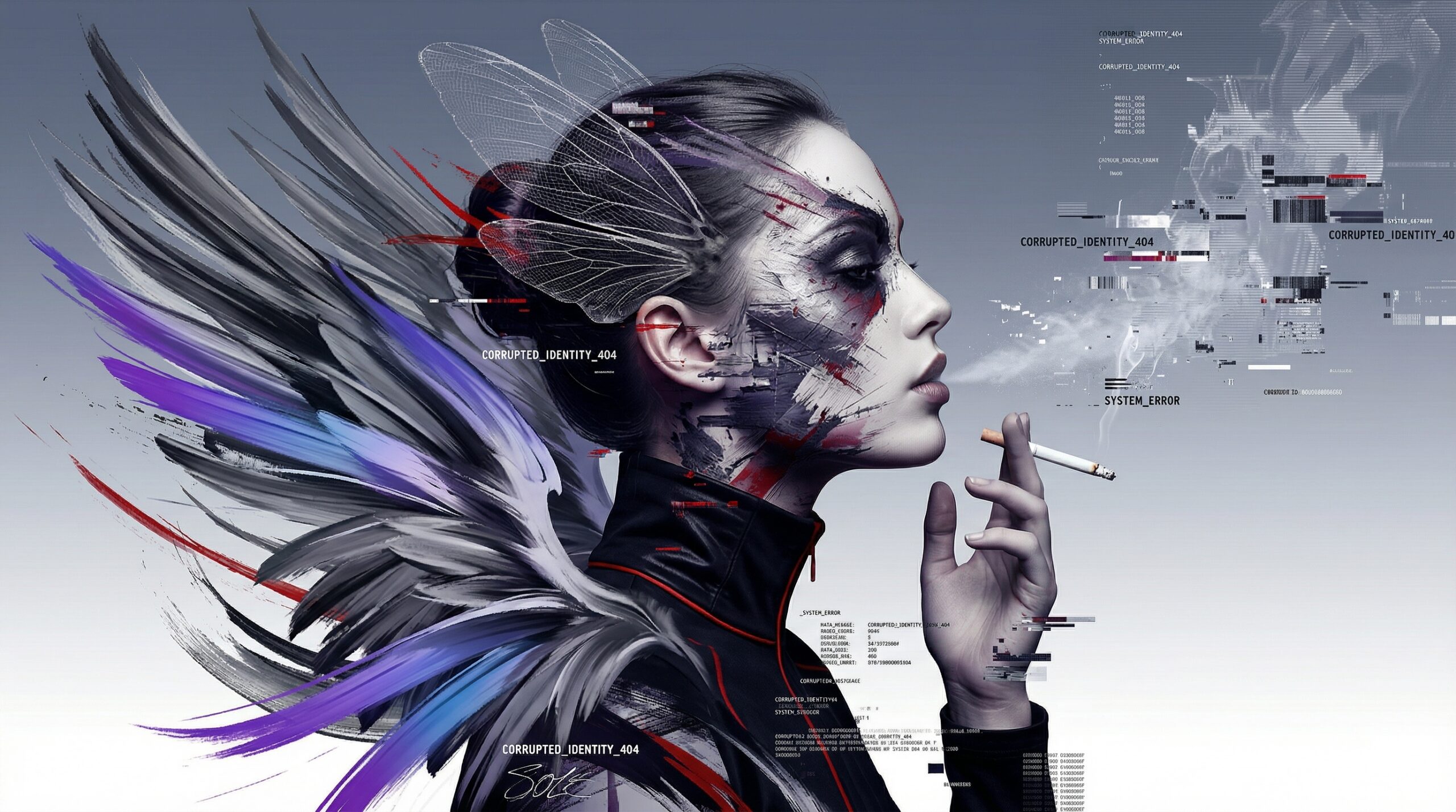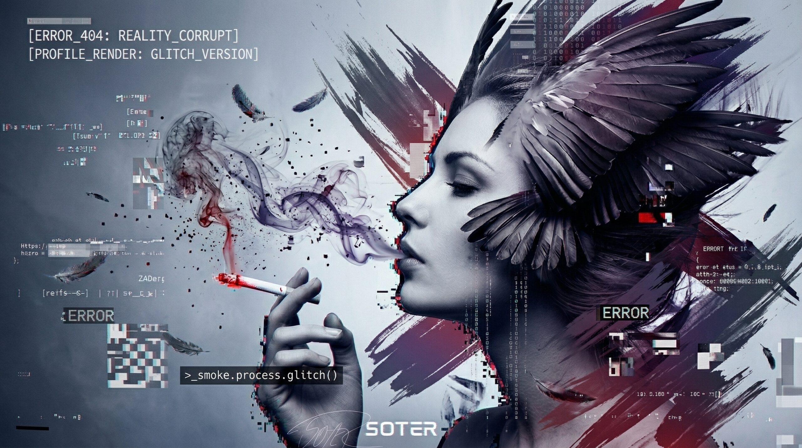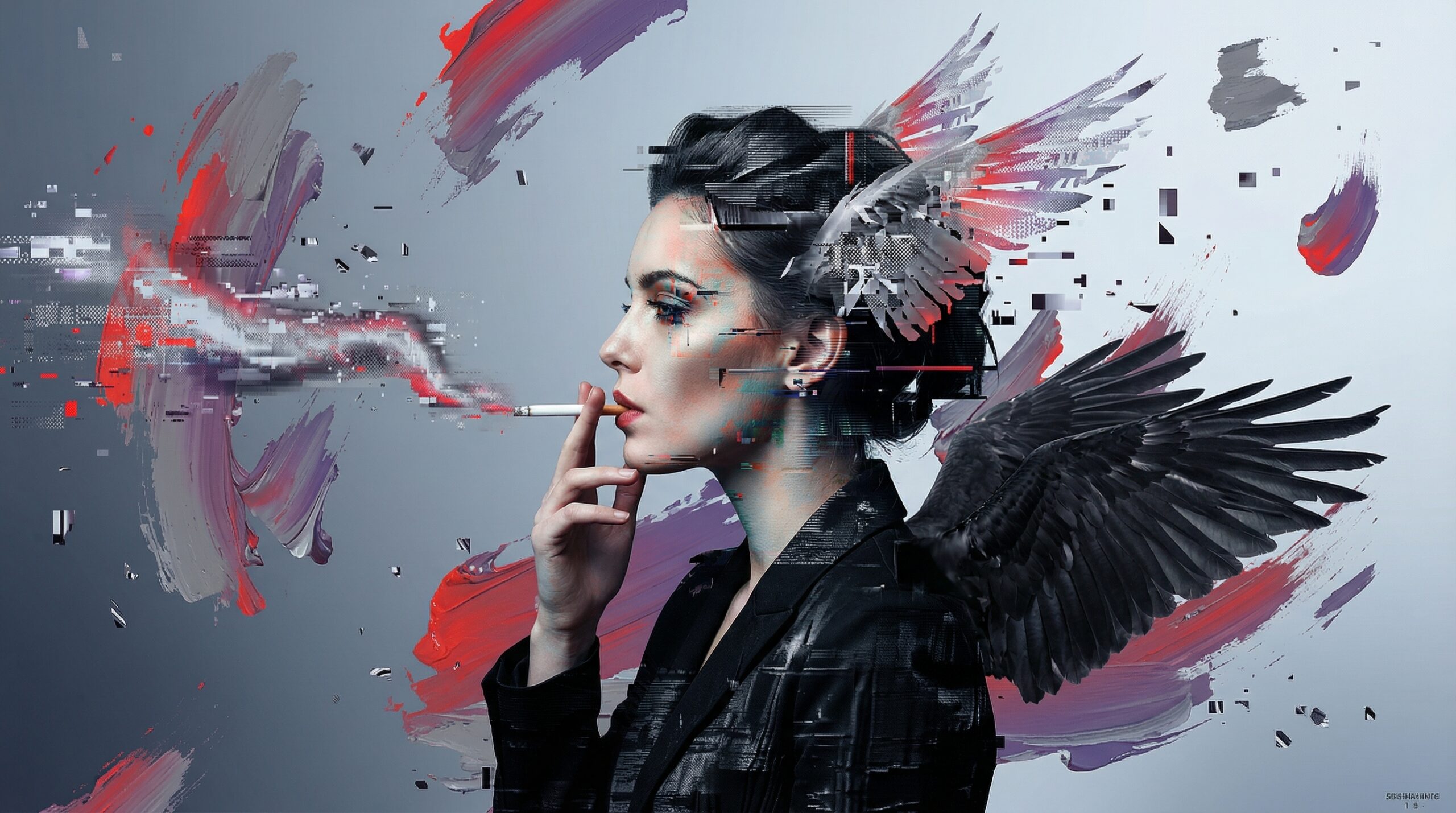 The smoke drifting from her lips is more than a physical gesture; it resembles the exhalation of the soul—its dispersion into something formless and fleeting. Unlike classical religious imagery, where the soul ascends with clarity and purpose, here it dissolves into digital haze, losing coherence. It suggests a modern existential condition in which the individual no longer loses only faith in the divine, but also continuity within the self.